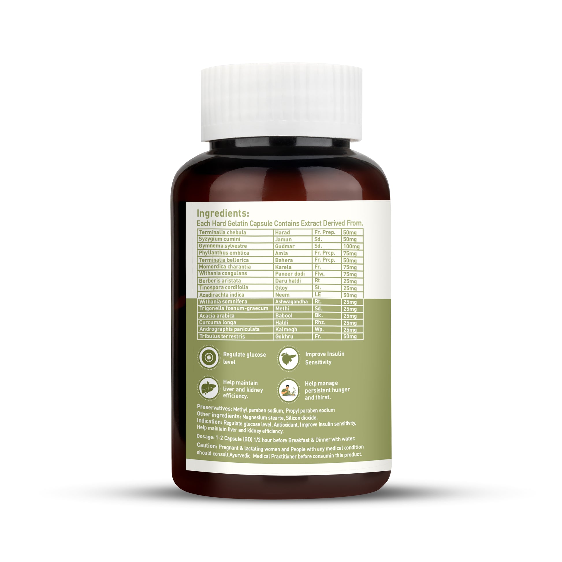 An Ayurvedic blend of Harad, Jamun, Gudmar, Karela, Neem, Giloy, and other herbs, formulated to support healthy blood sugar levels and overall wellness.